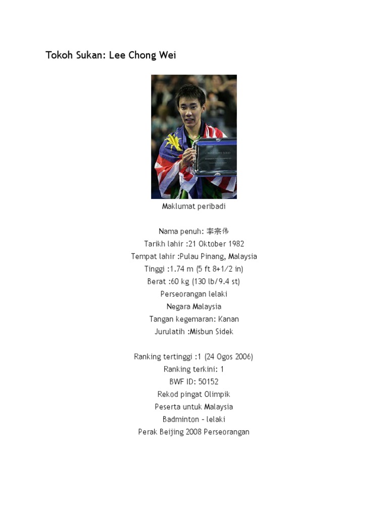 Tokoh Sukan Negara Biodata Dato Lee Chong Wei