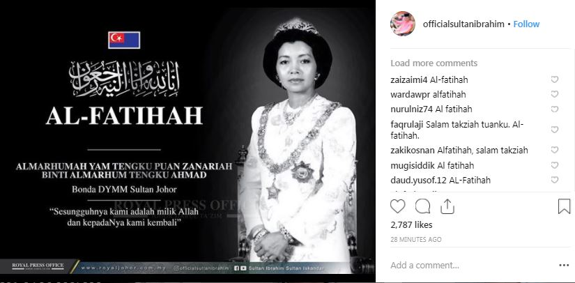 Bonda sultan johor mangkat. Bonda kepada sultan johor sultan ibrahim iskandar iaitu enche besar hajah kalsom abdullah kembali ke rahmatullah semalam. Kemangkatan baginda dimaklumkan menerusi laman instagram rasmi sultan johor sultan ibrahim sultan iskandar. Bonda sultan johor tuanku puan zanariah tengku ahmad dilaporkan mangkat malam tadi.