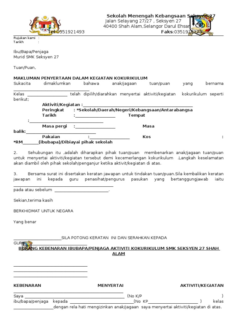Beberapa contoh surat makluman aktiviti kokurikulum kepada ibu bapa terbaru 2019. Surat akuan kebenaran ibu bapa penjaga menyertai aktiviti kokurikulum luar saya nama. Jelaslah bahawa aktiviti kokurikulum memberikan pengisian masa lapang yang sangat bermanfaat kepada pelajar pelajar.