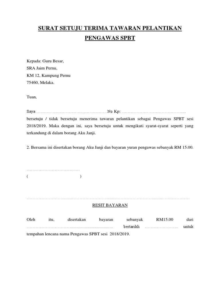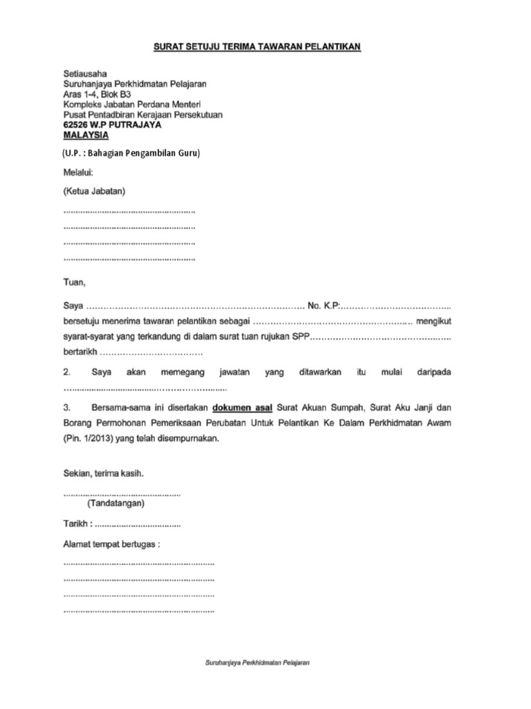 Borang surat setuju terima pelantikan. Surat setuju terima pelantikan ketua setiausaha kementerian sesuka hati aku aras18 benjana paradise tower pulau benjana kumpulan 789456 wilayah sesukahati aku lah tuan puan setuju terima perlantikan saya terima tawaran perlantikan sebagai gred mengikut syarat syarat yang terkandung di dalam surat tuan puan bil. Surat setuju terima tawaran pelantikansetiausahasuruhanjaya perkhidmatan pelajaranaras 1 4 blok b3kompleks jabatan perdana menteripusat pentadbiran kerajaan persekutuan62526 w p putrajayamalaysia. Surat setuju terima pelantikan.