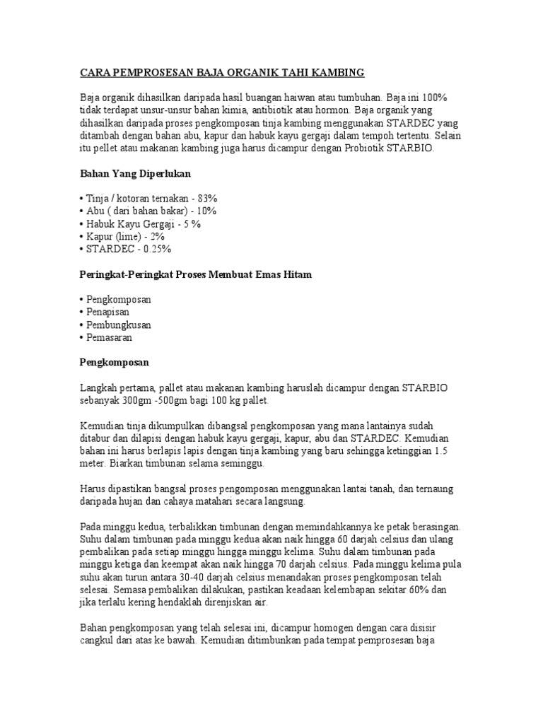 Cara membuat kompos dari kotoran kambing tak banyak yang tahu bahwa kotoran kambing yang kelihatannya tidak bermanfaat sama sekali ternyata sangat bermanfaat untuk tanaman. Jika kita kira balik sebanyak sembilan tan metrik tinja mentah mampu menghasilkan 10 5 tan metrik baja organik setelah di proses dengan baik menggunakan kaedah yang betul. Berikut adalah contoh baja organik dan fungsi pada tanaman.