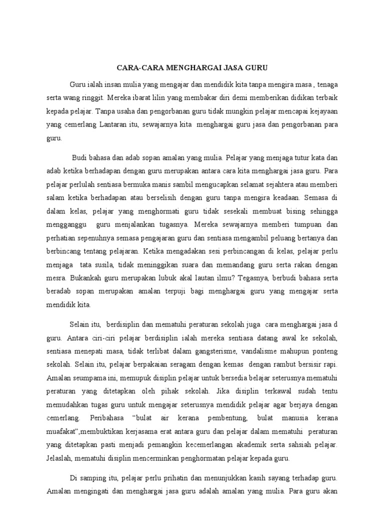 Mereka ibarat lilin yang membakar diri demi memberikan didikan terbaik kepada pelajar. Ipendidikan karangan cara cara menghargai jasa guru contoh karangan disemak dan dikemaskini pada pukul 9 58 pm 26 april 2020 bagi menjawab soalan penulisan karangan bahasa melayu pelajar digalakkan untuk melakukan latihan yang diberikan oleh guru serta merujuk sumber tambahan secara atas talian. Cara cara menghargai jasa guru guru ialah insan mulia yang mengajar dan mendidik kita tanpa mengira masa tenaga serta wang ringgit.