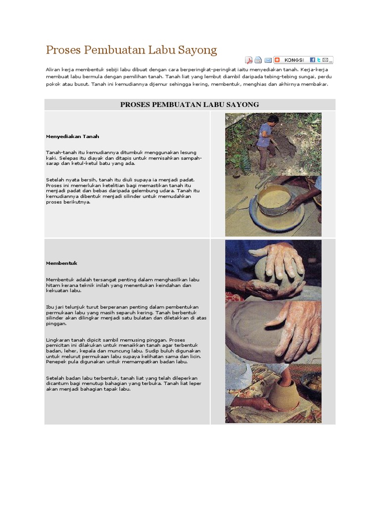 Contoh pembuatan labu menggunakan tanah liat. Labu sayong tetap dikagumi dan diminati bukan kerana penggunaannya semata mata tapi disebabkan nilai estetikanya. Tanah ini kemudiannya dijemur sehingga kering membentuk menghias dan.