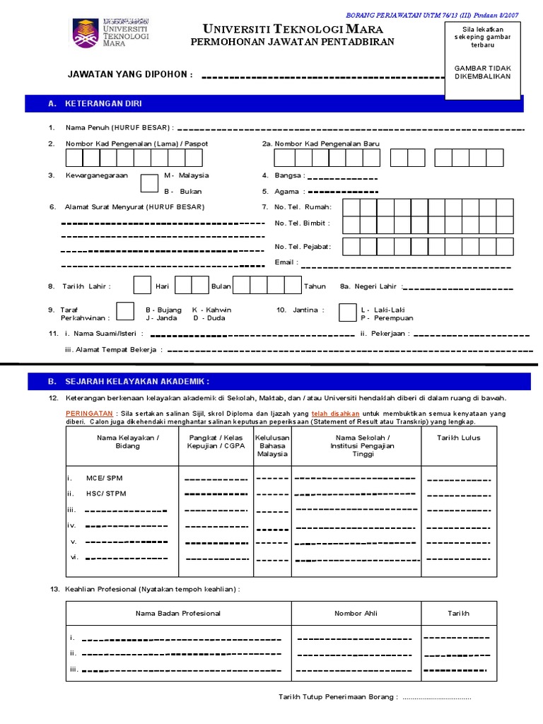 Borang Jawatan Kosong Pejabat Pembangunan Universiti Teknologi Mara Uitm