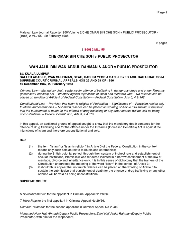 Che Omar Bin Che Soh V Public Prosecutor Pdf Page 1 Malayan Law Journal Reports 1988 Volume 2 Che Omar Bin Che Soh V Public Prosecutor 1988 2 Mlj Course Hero